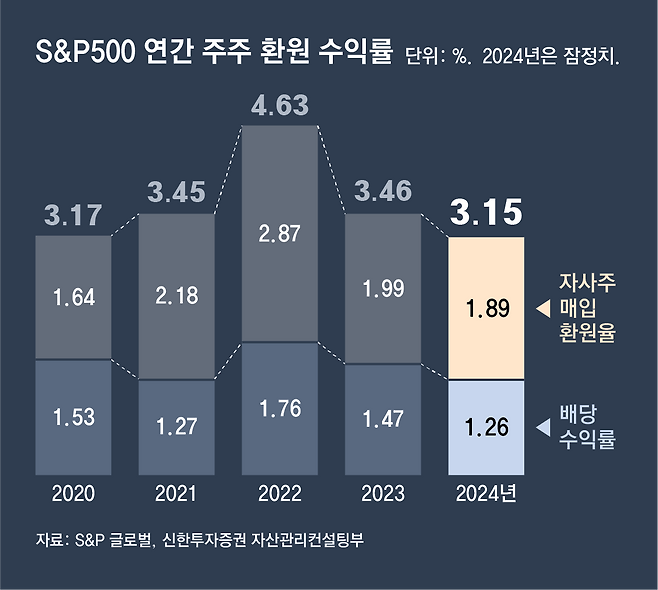 또 최근에는 배당수익률뿐만 아니라, 자사주 소각을 포함한 ‘주주환원율’이 주목받고 있다. 자사주 소각은 기업이 시장에서 주식을 매입해서 소각하거나, 기존에 보유하고 있던 자사주를 없애는 것을 의미한다. 이 경우 기존 주식의 주당 가치가 자사주 소각 수량에 맞춰 상승하기 때문에 주주 가치도 올라간다. 미국의 경우 2017년 법인세 인하 이후 기업의 자사주 매입 및 소각이 크게 늘었으며, 전체 주주 환원에서 자사주 소각이 차지하는 비중이 배당보다 오히려 크다.