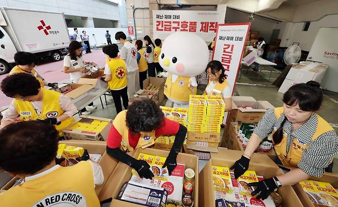| 재난 대비 비상식량세트 제작 23일 오전 부산 부산진구 대한적십자사 부산지사 앞 임시 구호창구에서 적십자사 직원과 자원봉사자들이 재난 대응용 비상식량세트를 제작하고 있다. 이날 봉사자들은 여름철 태풍, 집중 호우 등 각종 재난에 대비해 즉석밥, 국, 컵라면 등 10가지 식료품을 담은 긴급 구호세트를 마련했다. 완성된 식량세트는 향후 이재민 발생 시 현장에 전달될 예정이다. 부산=뉴시스 |
