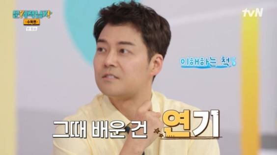 이어 "나 빼고 전부 수학을 잘했고, 난 영어를 잘했다. 그래서 그때 배운 건 연기였다. 쪽팔리니까 이해하는 척했다"며 "잘 안 떠올라서 뭘 쓰고 있으면 '이거 몰라? 대학 안 갈거야?'라고 물어본다. 그러면 '아아~; 그러면서 아는 척 연기했다. 그 모임에서 낙오될까봐, 우리 엄마가 돈 들여서 보내줬는데 낙오될까봐 아는 척 연기를 했었다"며 과거를 회상했다.