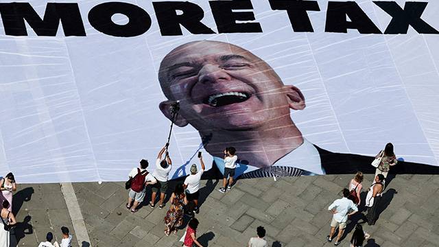 현수막에는 베이조스의 웃는 얼굴과 함께 '결혼식을 위해 베네치아를 빌릴 수 있다면 세금을 더 많이 내야 한다'는 문구가 영어로 큼지막하게 적혀 있었습니다.