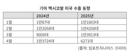 24일 파이낸셜뉴스가 수출입 통관데이터 업체 임포트지니어스 코리아를 통해 받은 자료에 따르면 올해 4월 기아가 멕시코에서 미국으로 수출한 차는 6271대로 전년 동기 대비 54.3% 줄었다. 전월과 비교해도 54.9% 감소한 수치다. 한 달 새 절반 이하로 떨어진 것이다.