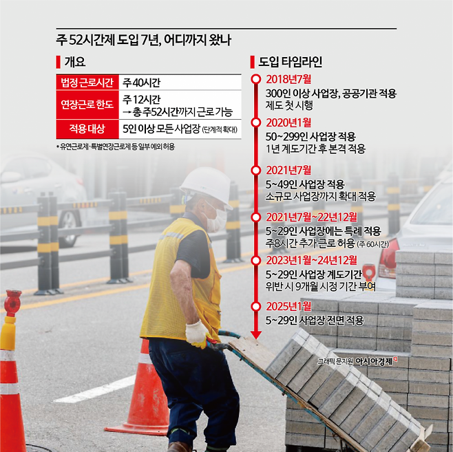 2018년 도입된 주 52시간제는 300인 이상 사업장과 공공기관에 우선 적용됐고, 이후 2020년 300인 미만, 2021년 50인 미만으로 확대됐다. 올해부터는 계도기간이 종료돼 30인 미만 사업장에서도 전면 시행됐다. 중소기업에도 이 규제가 적용된 지 5년이 지난 가운데 중소기업계 곳곳에서 파열음이 솟구친다. 자동차 정비업과 같이 인건비 비중이 높고 숙련인력 확보가 어려운 업종일수록 일률적인 규제 적용의 타격이 크다. 중소기업중앙회 조사에 따르면 중소 제조업체의 39.6%가 주 52시간제 시행 이후 인력난을 가장 큰 애로로 꼽는다.