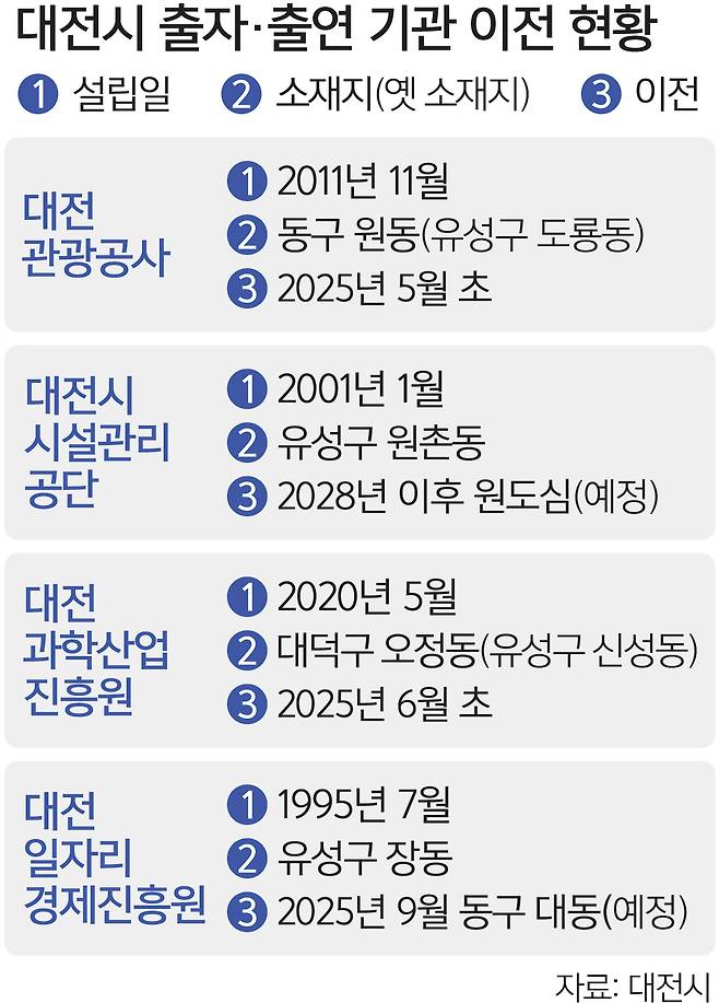 역시 대덕특구인 유성 장동에 있는 일자리경제진흥원은 9월 동구 대동으로 본원 이전을 앞두고 있고, 유성구 원촌동에 있는 대전시시설관리공단은 사옥 임차기간인 2028년 이후 원도심 이전을 계획하고 있다.
