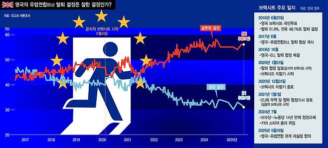 23일 영국이 2016년 6월23일 국민투표로 유럽연합(EU) 탈퇴(브렉시트)를 결정한 지 9년이 됐다. 유럽연합과 협상을 거쳐 공식 탈퇴한 2020년 이후로는 5년이 지났다. 그러나 유럽연합과 이별을 선언했던 영국은 최근 유럽연합과 다시 밀착하고 있고, 영국 여론은 술렁이고 있다.