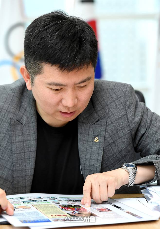 스포츠서울 창간 40주년(1985년 6월22일 1호 발행) 인터뷰에서 만난 유승민(43) 대한체육회장은 2004년 아테네 올림픽 탁구 남자 단식에서 세계 최강자 왕하오(중국)를 꺾고 역사적인 금메달을 차지한 순간이 담긴 21년 전 본지 지면을 바라보며 웃었다. 그는 “(아테네 당시 핸드볼 여자 대표) 임오경 의원, (축구의) 신태용 김도훈 감독도 보인다. 추억이 새록새록 떠오른다”며 함께 지면에 등장한 인물을 꼼꼼히 들여다봤다. 또 “과거 스포츠서울에서 탁구를 담당하신 고 신명철 기자께서 중고연맹 대회 단상에 올라 ‘행정이 이래도 되느냐’며 불합리한 제도를 용기 있게 지적하신 기억도 있다”면서 앞으로도 본지가 체육 개혁의 파트너이자 동력이 돼 주기를 바랐다.