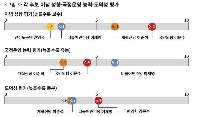 조사 참여자들에게 각 후보의 이념 성향과 국정운영 능력, 도덕성을 1~10점으로 평가해달라고도 했다(〈그림 7〉). 0은 매우 진보, 5는 중도, 10은 매우 보수라고 할 때, 민주노동당 권영국 후보가 2.5점, 이재명 후보가 3.1점으로 ‘진보’적이라 평가받았다. 이준석 후보는 6.0점이었는데, ‘중도 보수’ 노선을 내세운 이재명 후보보다 이준석 후보가 이 포지션을 획득한 걸로 보인다. 김문수 후보는 8.0점이다.