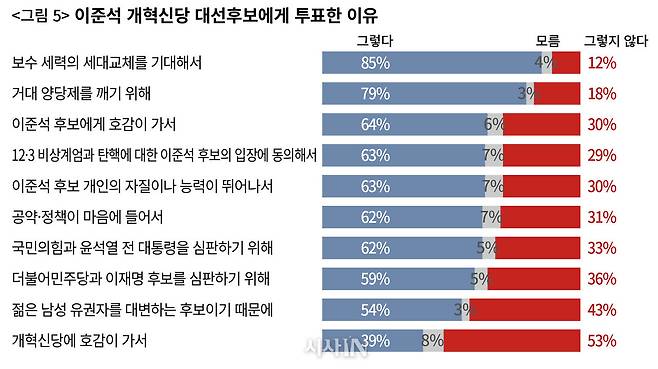 그렇다면 이들이 이준석 후보를 뽑은 이유는 무엇일까. 예상되는 이유를 여럿 제시하고 동의 여부를 물었다(〈그림 5〉). 가장 동의가 높았던 문항은 ‘보수 세력의 세대교체를 기대해서(85%)’였고 ‘거대 양당제를 깨기 위해(79%)’가 뒤를 이었다. 이준석 후보가 보인 반(反)페미니즘 행보를 염두에 두고 ‘젊은 남성 유권자를 대변하는 후보이기 때문에’ 이준석을 찍었는지도 물어봤는데, ‘그렇다’는 응답이 54%, ‘그렇지 않다’는 43%였다.
