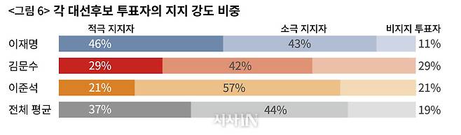 지금까지의 논의에서 알 수 있는 사실이 있다. 유권자들은, 때로는 정치적 견해에 동의하지 않더라도 ‘다른 후보를 막기 위해서’ 등의 이유로 그 후보를 찍는다는 점이다. 이에 착안해 우리는 각 후보를 찍은 유권자들에게 세 가지 선택지를 제시했다. 그 후보를 ‘적극적으로 지지하기 때문에 투표’했는지, ‘완전히 지지하지는 않지만, 다른 후보들보다 좀 더 낫다고 판단해 투표’했는지, ‘지지하지 않지만, 선택 가능한 대안이 없어서 투표’했는지다.