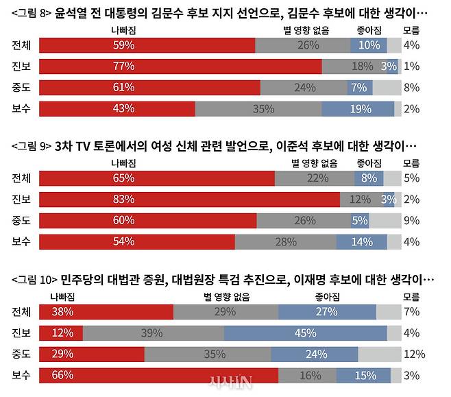 선거 기간 각 후보들에게는 크고 작은 ‘악재’ 내지는 ‘논란’이 있었다. 이 이슈들을 제시하고 각 후보에 대한 생각이 어떻게 바뀌었는지 물었다. 이번 대선이 기본적으로 계엄과 탄핵의 자장 속에서 치러졌음을 고려할 때, 가장 주목받은 장면 중 하나는 윤석열의 김문수 후보 지지 선언이었다. 그것이 김문수 후보에게 끼친 악영향은 처참했다. 조사 참여자의 59%가 김문수 후보에 대한 생각이 ‘나빠졌다’고 답했다. ‘매우 나빠졌다’는 강한 응답만 42%가 나왔다. ‘별 영향 없음’은 26%, ‘좋아졌다’는 응답은 10%에 불과했다. 중도층의 61%가 ‘나빠졌다’고 답했고 ‘좋아졌다’는 응답은 7%에 불과했다. 보수층 내에서도 43%가 ‘나빠졌다’고 답했고 ‘좋아졌다’는 19%에 그쳤다(〈그림 8〉).