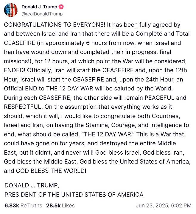 도널드 트럼프 미국 대통령이 23일(현지시간) 소셜미디어(SNS) 트루스소셜에 올린 글을 통해 "이스라엘과 이란이 완전한 휴전에 합의했다"고 밝혔다.