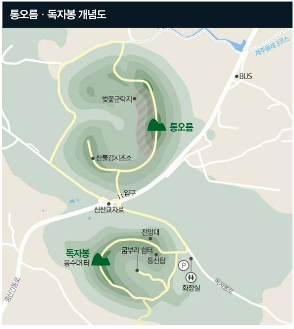 길 하나를 끼고 자락을 맞댄 통오름(143.1m)과 독자봉(159.3m)은 높이가 비슷하고, 덩치도 고만고만하다. 그래서 오름을 탐방하는 이 대부분이 두 오름을 이어 걷는다. 세 시간이면 넉넉한 부담 없는 코스다.