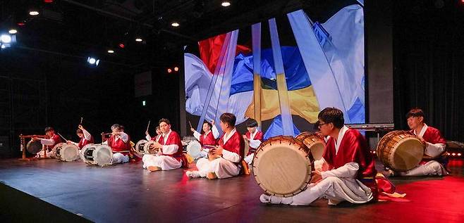 [서울=뉴시스] 22일 일본 오사카 '2025 오사카엑스포' 실내 페스티벌 스테이션에서 크라운해태제과 임직원들이 '사물놀이 삼도농악가락' 공연을 하고 있다. (사진=크라운해태제과 제공) 2025.06.24. photo@newsis.com *재판매 및 DB 금지