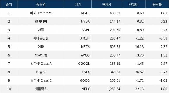 마이크로소프트는 486.00 달러로, 1.80% 상승했다. 메타는 698.53 달러로 2.37% 올랐다. 엔비디아는 144.17 달러로 보합세를 기록하며 큰 변동이 없었다.