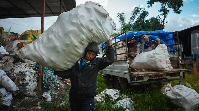 ▲ 네팔 카트만두에서 페트병 옮기는 노동자