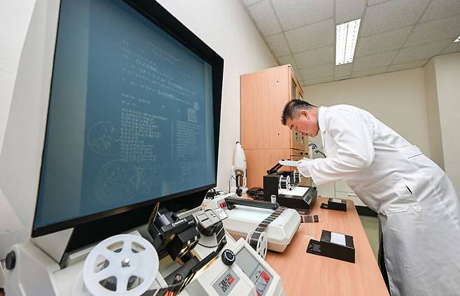[서울=뉴시스] 23일 충남 계룡대 육군기록정보관리단에서 열린 중요 역사기록물 복원사업 현장 공개에서 복원 관계관이 마이크로 필름 현상 과정을 육안으로 검사하고 있다. (사진=육군 제공) 2025.06.24. photo@neㅁwsis.com *재판매 및 DB 금지
