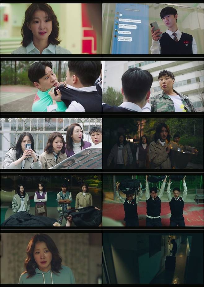 이때 아파트 단지 해결사 4인방이 등장했다. 미리가 먼저 일진들에게 물벼락을 선사했고, 경자는 "난 절대 먼저 때리지 않아"라며 공격을 뛰어넘는 방어 전술로 제압에 나섰다. 결국 일진들을 무릎 꿇게 만든 네 사람은 모두 민우 엄마를 자처하며 "우리 아들 민우 건들지 마"라고 경고했다.
