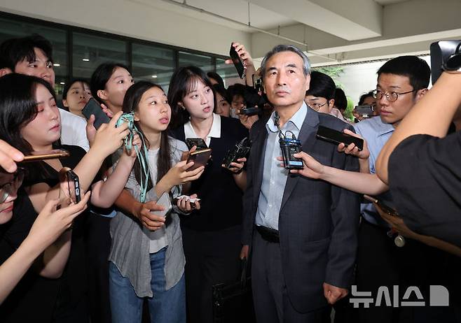[서울=뉴시스] 이영환 기자 = 김건희 여사 의혹을 수사하는 민중기 특별검사가 24일 오전 서울 서초구의 사무실로 출근하며 취재진의 질문을 듣고 있다. 2025.06.24. 20hwan@newsis.com