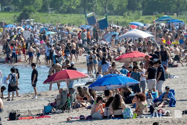 [토론토=AP/뉴시스] 23일(현지 시간) 캐나다 토론토 기온이 36도까지 치솟은 가운데, 더위를 피하려는 시민들로 해변이 북적이고 있다. 2025.06.24.