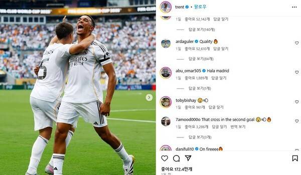 새로운 레알 이적생 알렉산더아놀드 역시 기쁨을 만끽했다. 그는 자신의 사회관계망서비스(SNS)를 통해 "레알의 흰 유니폼을 입고 첫 승을 거뒀다. 할라 마드리드!"라며 자축했다. 이윽고 벨링엄, 브라힘 디아즈, 귈러 등 동료들은 칭찬을 아끼지 않았다.