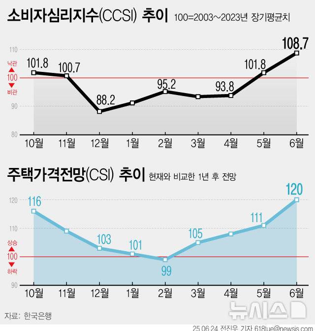 [서울=뉴시스] 24일 한국은행에 따르면 주택가격전망CSI는 120으로 전월보다 9포인트 올랐다. 집값 급등기였던 2021년 10월(125) 이후 최고치로 5개월 연속 상승세다. 새 정부 출범에 따른 정치 불확실성 해소와 추가경정예산 등 재정 확대 등에 소비심리도 4년 만에 최고 수준을 보였다. (그래픽=전진우 기자)