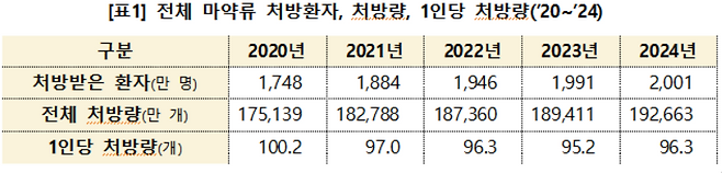 총 처방량(19억2천663만개)을 기준으로 하면 1인당 약 96만개의 의료용 마약류가 처방된 것으로 나타났습니다.