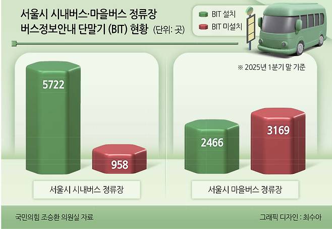 실제 서울 마을버스 정류장 2곳 중 1곳은 BIT가 설치되지 않았다. 24일 조승환 국민의힘 의원실이 서울시로부터 제출받은 자료에 따르면 올해 1분기 말 기준 서울시 마을버스 정류장 5635곳 중 BIT가 설치된 곳은 2466곳(43.8%), 미설치된 곳은 3169곳(56.2%)으로 집계됐다. 이는 같은 기간 BIT 설치율 85.6%에 달하는 서울 시내버스 상황과 대조적이다.