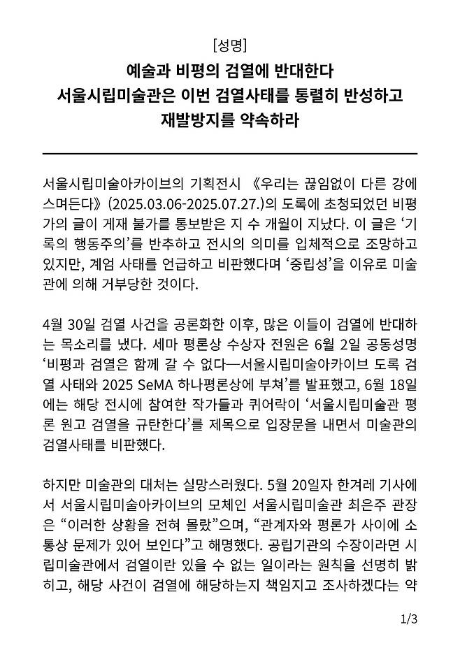 세마-하나평론상 수상자들을 포함한 동료 평론가들이 지난 2일 서울시립미술관의 ‘검열’에 항의하는 연대 성명을 발표한 데 이어 지난 18일에는 해당 전시에 참여한 작가들이 ‘검열을 규탄한다’는 내용의 입장문을 발표했다.