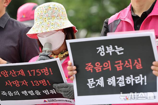 [서울=뉴시스] 황준선 기자 = 폐암 산업재해 피해자 학교 급식 조리사가 24일 오전 서울 용산구 대통령실 앞에서 열린 죽음의 학교 급식실 폐암 산재 문제 해결을 위한 학교급식법 개정 촉구 기자회견에서 발언하고 있다. 2025.06.24. hwang@newsis.com