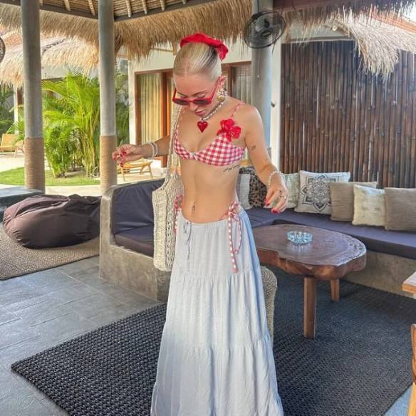 방금 막 짜낸 케찹처럼 광택감이 흘러 넘치는 레드 톱에 블랙 미니 스커트를 매치한 에바 로즈. Y2K 무드와 퓨처리즘 코드가 절묘하게 섞인 스타일링이네요. 평소 테니스를 즐길 때도 레드 슬리브리스 톱을 입어 그녀 특유의 건강하고 에너제틱한 분위기를 내뿜습니다.