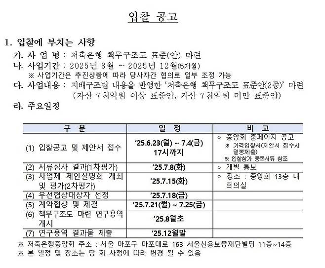 입찰에 참여하는 업체는 다음 달 15일 저축은행중앙회 13층 대회의실에서 30분간 제안 내용 발표와 질의응답을 하게 됩니다.