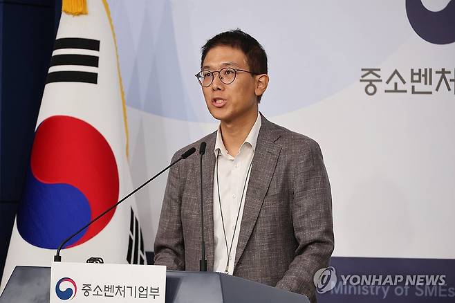 (서울=연합뉴스) 이정훈 기자 = 황영호 중소벤처기업부 소상공인경영안정지원단장이 24일 서울 종로구 정부서울청사 별관에서 소상공인 경영부담 완화를 위한 3대 지원사업 시행과 관련해 브리핑하고 있다. 2025.6.24