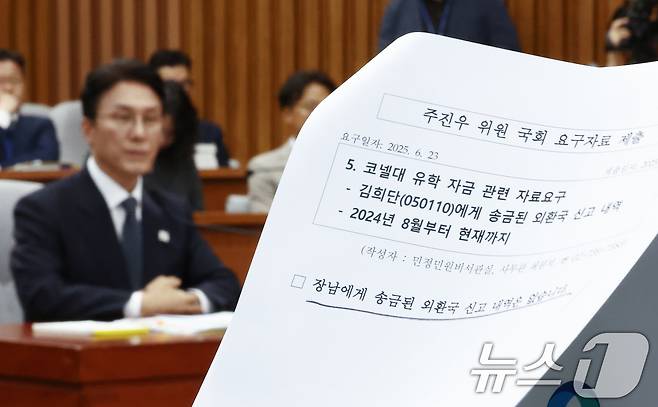 (서울=뉴스1) 김민지 기자 = 24일 오전 서울 여의도 국회에서 김민석 국무총리 후보자에 대한 인사청문회가 진행되고 있는 가운데 주진우 국민의힘 위원이 김 총리 후보자 자녀의 코넬대 유학 자금 관련 요구자료에 대한 답변서를 들고 있다. 2025.6.24/뉴스1