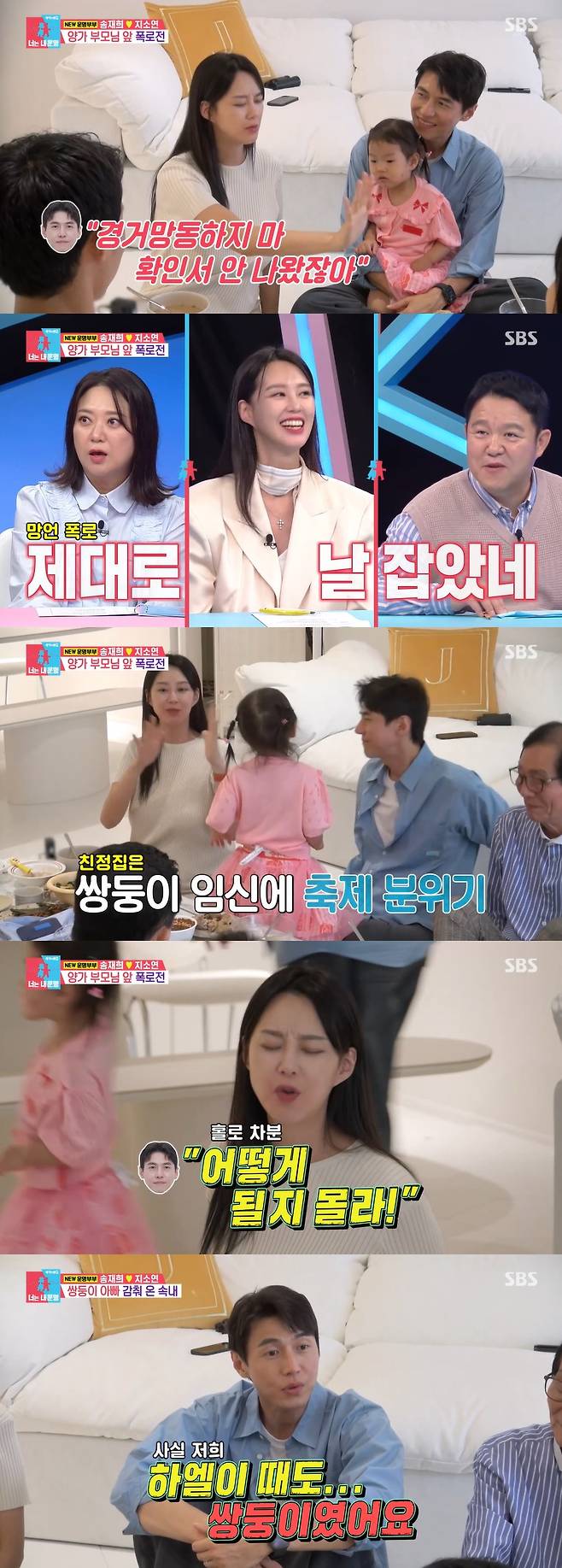 지소연은 "축제였다. 저희 집은 축제였는데 오빠 혼자 '어떻게 될지 몰라'(라고 하더라)"라고 말했다. 이에 송재희는 "처음에 임신 소식 들었을 때. 특히 쌍둥이 소식 들었을 때 축하하지 못했던 거는 저희 첫째 때도 쌍둥이였다"라고 고백했다.