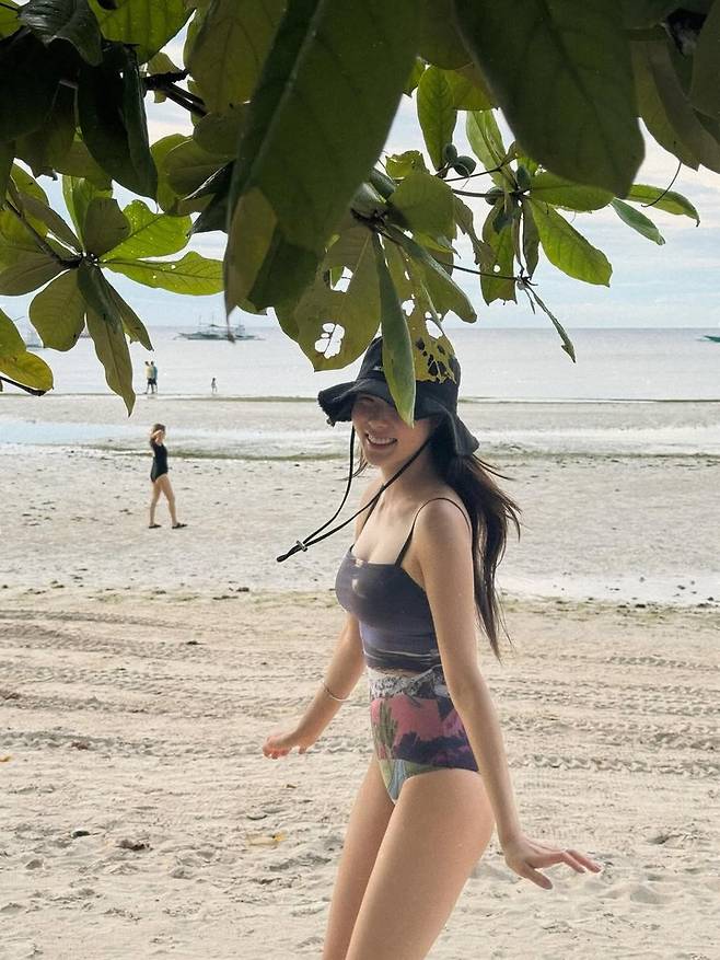 또 다른 컷에서는 빈티지한 일러스트 패턴이 돋보이는 하이웨이스트 수영복을 입고, 블랙 버킷햇을 매치해 경쾌한 해변 스타일을 연출했다. 얇은 스트랩과 허리 라인을 강조하는 컷아웃 디자인은 슬림한 실루엣을 부각시키는 동시에 자유로운 무드를 전한다.