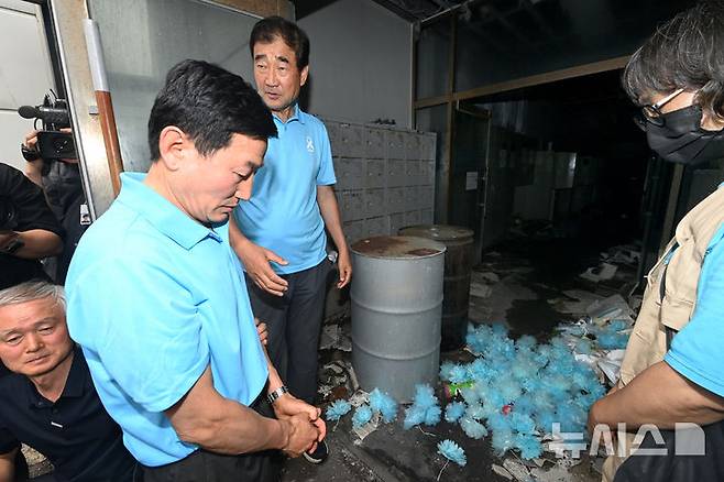 [화성=뉴시스] 김종택 기자 = 24일 오전 경기 화성시 전곡리 아리셀 참사 화재현장에서 열린 '아리셀 참사 1주기 현장 추모 위령제'에서 유가족들이 헌화하고 있다. (공동취재) 2025.06.24. photo@newsis.com