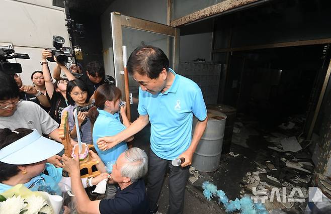 [화성=뉴시스] 김종택 기자 = 24일 오전 경기 화성시 전곡리 아리셀 참사 화재현장에서 열린 '아리셀 참사 1주기 현장 추모 위령제'에서 유가족들이 헌화하고 있다. (공동취재) 2025.06.24. photo@newsis.com
