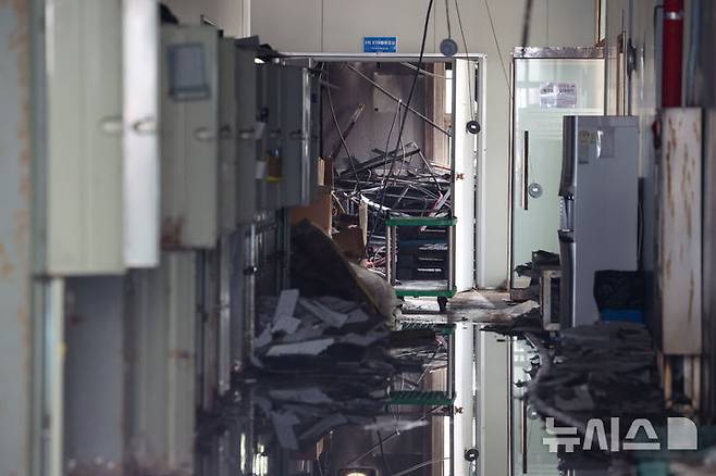 [화성=뉴시스] 김종택 기자 = 24일 오전 경기 화성시 전곡리 아리셀 참사 화재현장에서 열린 '아리셀 참사 1주기 현장 추모 위령제'에서 화재 건물 내부가 공개되어 있다. (공동취재) 2025.06.24. photo@newsis.com