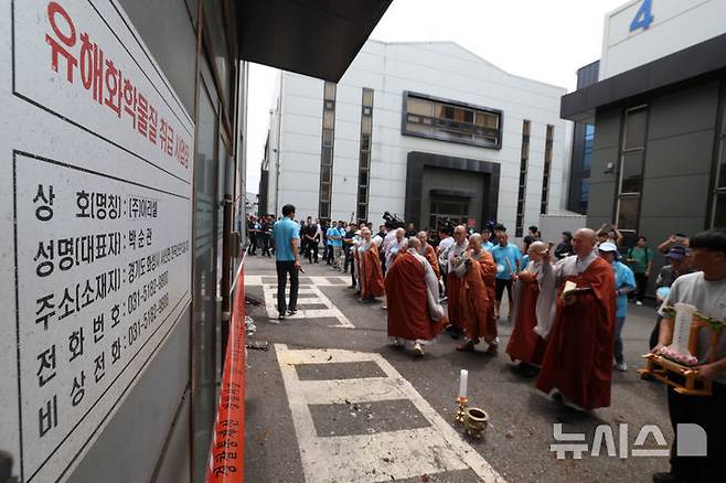 [화성=뉴시스] 김종택 기자 = 24일 오전 경기 화성시 전곡리 아리셀 참사 화재현장에서 열린 '아리셀 참사 1주기 현장 추모 위령제'에서 유가족들이 위패를 들고 이동하고 있다. (공동취재) 2025.06.24. photo@newsis.com