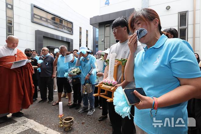 [화성=뉴시스] 김종택 기자 = 24일 오전 경기 화성시 전곡리 아리셀 참사 화재현장에서 열린 '아리셀 참사 1주기 현장 추모 위령제'에서 유가족들이 눈물을 흘리고 있다. (공동취재) 2025.06.24. photo@newsis.com