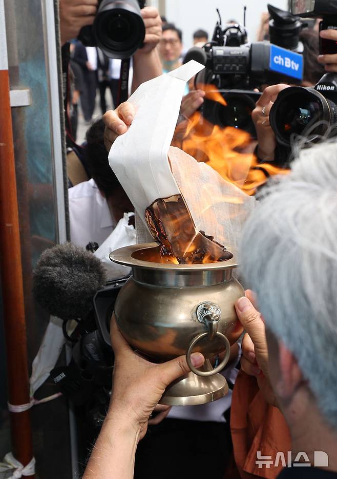 [화성=뉴시스] 김종택 기자 = 24일 오전 경기 화성시 전곡리 아리셀 참사 화재현장에서 열린 '아리셀 참사 1주기 현장 추모 위령제'에서 유가족들이 위패를 태우고 있다. (공동취재) 2025.06.24. photo@newsis.com