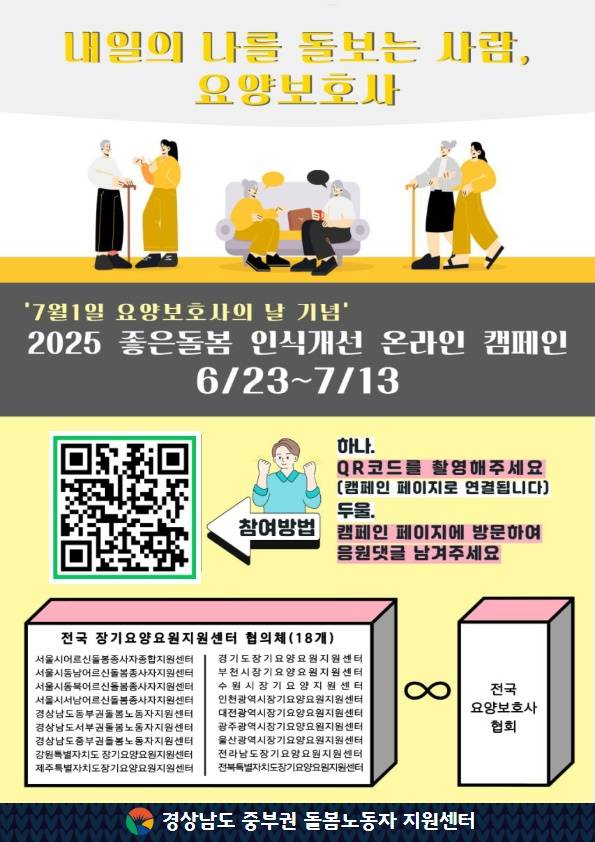 18개 지원센터로 구성된 전국장기요양요원지원센터협의체와 전국요양보호사협회는 지난 23일부터 "내일의 나를 돌보는 사람, 요양보호사"라는 구호를 내걸고 오는 7월 13일까지 다양한 인식개선 활동을 벌이고 있다.