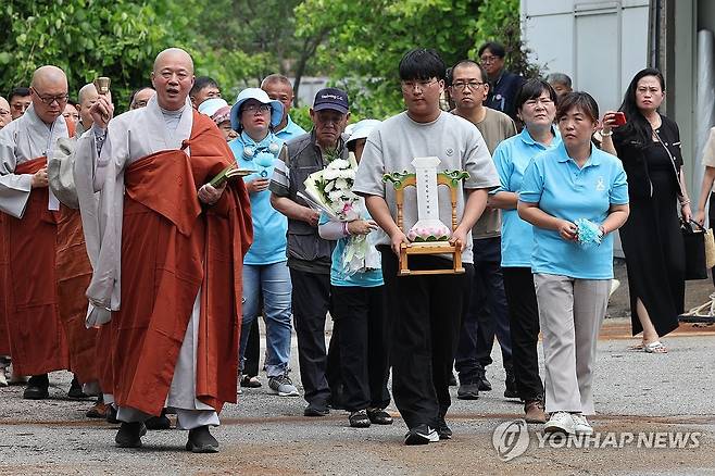 (화성=연합뉴스) 홍기원 기자 = 24일 경기도 화성시 아리셀 화재 사고 현장에서 열린 '아리셀 참사 1주기 현장 추모 위령제'에서 유가족과 참석자 등이 희생자 위패를 안고 화재 건물 앞으로 걸어가고 있다. 2025.6.24 [공동취재]