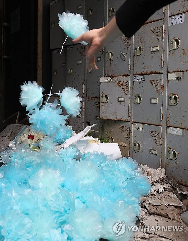 (화성=연합뉴스) 홍기원 기자 = 24일 경기도 화성시 아리셀 화재 사고 현장에서 열린 '아리셀 참사 1주기 현장 추모 위령제'에서 공장 안에 파란 꽃이 놓이고 있다. 2025.6.24 [공동취재]