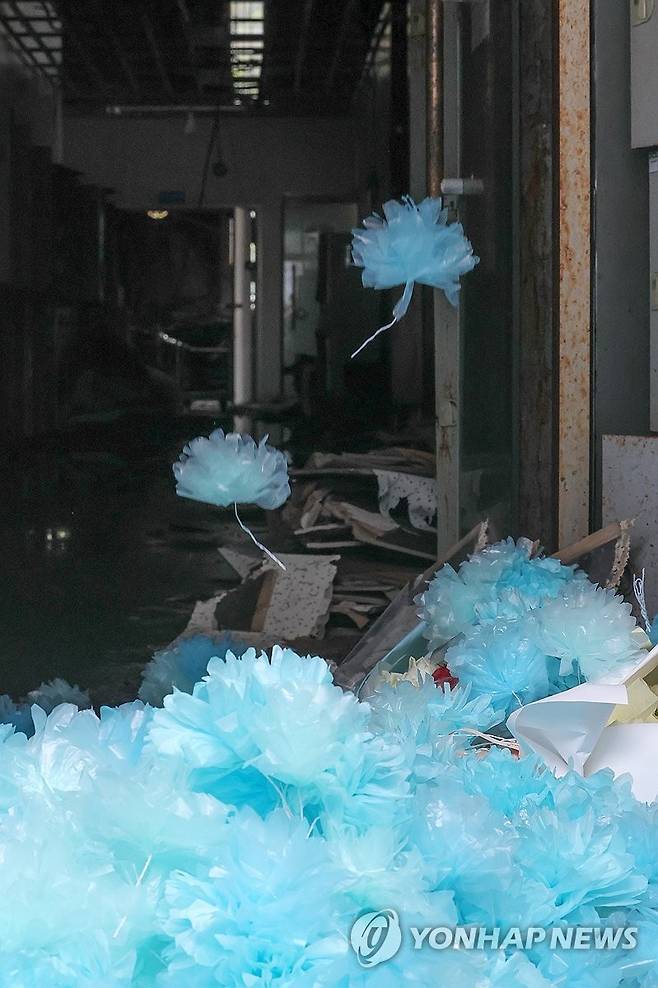 (화성=연합뉴스) 홍기원 기자 = 24일 경기도 화성시 아리셀 화재 사고 현장에서 열린 '아리셀 참사 1주기 현장 추모 위령제'에서 공장 안에 파란 꽃이 놓이고 있다. 2025.6.24 [공동취재]