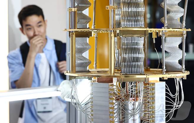 (서울=뉴스1) 김도우 기자 = 24일 서울 서초구 aT센터에서 열린 '퀀텀코리아 2025'에서 관람객들이 양자컴퓨터 모형을 살펴보고 있다. 2025.6.24/뉴스1
