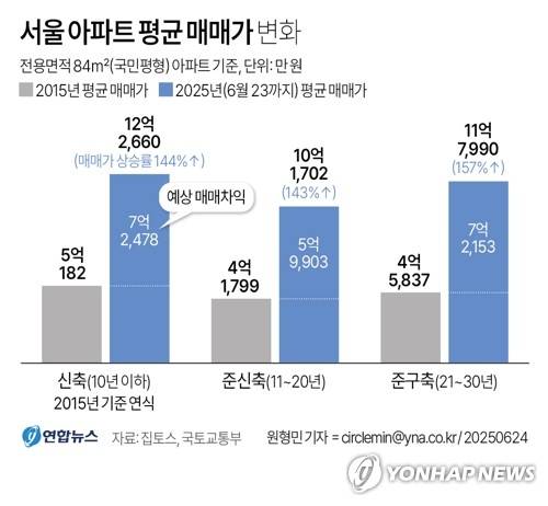 (서울=연합뉴스) 원형민 기자 = 24일 부동산 중개업체 집토스가 국토교통부 실거래가 자료를 분석한 결과 2015년 당시 5억182만원에 거래됐던 준공 10년 이하 서울 신축 전용면적 84㎡ 아파트가 올해 평균(6월 23일까지 기준) 12억2천660만원에 거래돼 7억2천478만원(144%)의 시세 차익을 남긴 것으로 추산됐다.