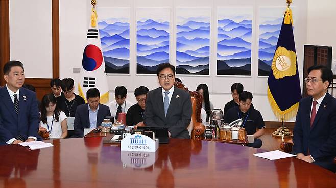 ▲ 우원식 국회의장과 여야 원내대표들이 24일 국회에서 추가경정예산안 처리를 위한 본회의 개최 일정과 상임위원장 재배분 문제 등을 논의하기 위해 회동하고 있다. 왼쪽부터 더불어민주당 김병기 당 대표 직무대행 겸 원내대표, 우원식 국회의장, 국민의힘 송언석 원내대표.