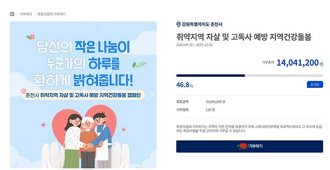 하지만 강원도 내 지자체의 지정 기부 사업은 춘천시가 모금하고 있는 '취약지역 자살 및 고독사 예방' 단 한 건뿐입니다. 지자체들이 기부 사업 발굴에 소극적이라는 지적이 나오는 대목입니다. 기부자들의 눈높이에 맞고, 지역에 꼭 필요한 지정 기부 사업을 발굴하는 것이 모금 전략에서 갈수록 중요해질 수밖에 없습니다.