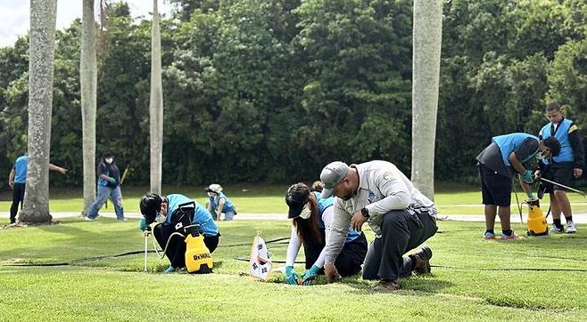 [서울=뉴시스] 국제청소년연합(IYF) 산하 굿뉴스코 푸에르토리코 해외봉사단이 6·25주간을 맞아 미국령 푸에르토리코 국립묘지를 방문해 6·25전쟁 참전용사들을 추모하고 묘역 정비 등 봉사활동을 하고 있다. (사진=굿뉴스코 푸에르토리코 해외봉사단 제공) 2025.06.24. photo@newsis.com *재판매 및 DB 금지