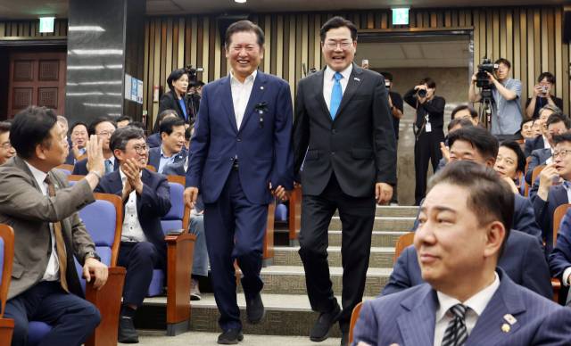 '결혼식처럼 손잡고 나란히'···정청래-박찬대 의총장 입장
